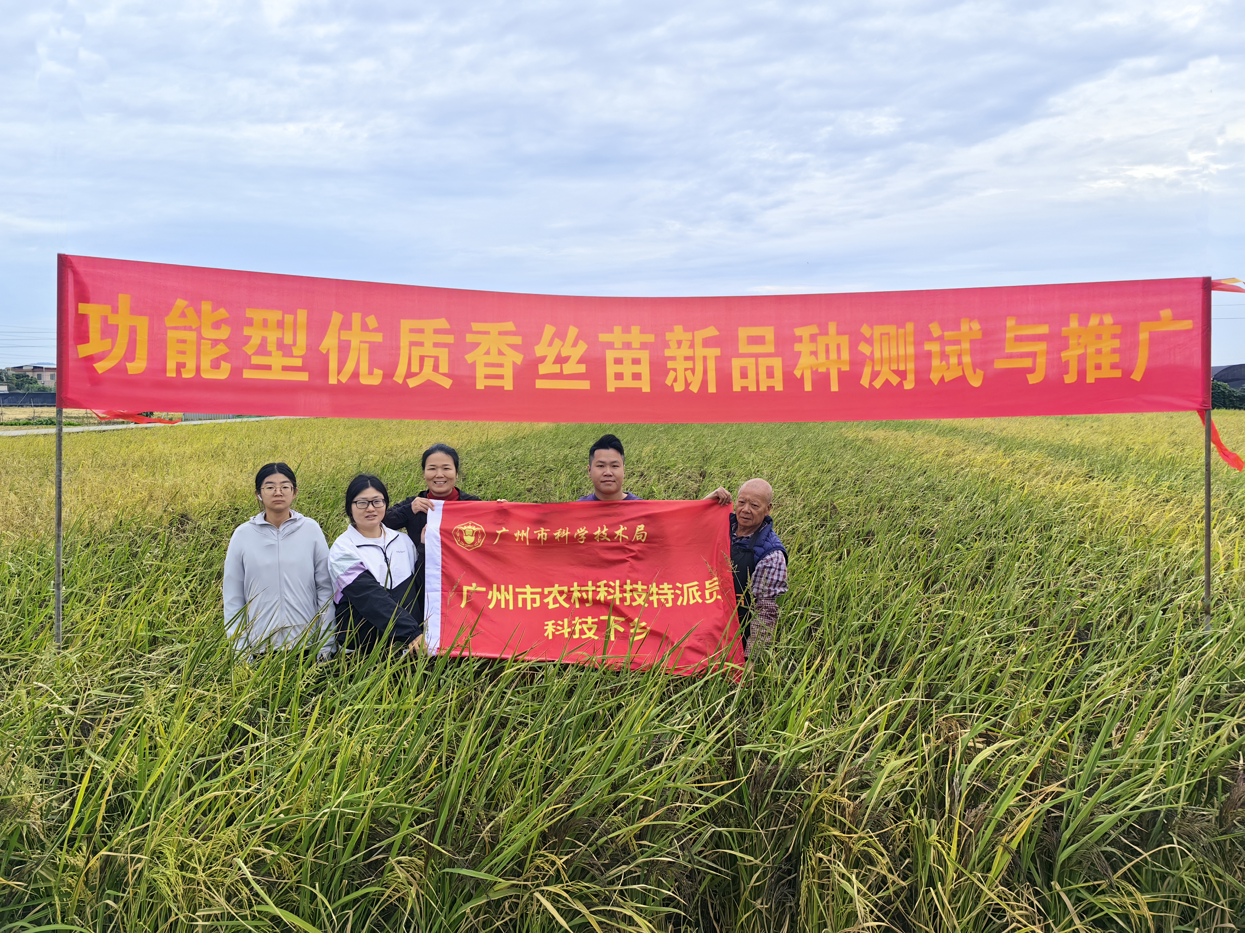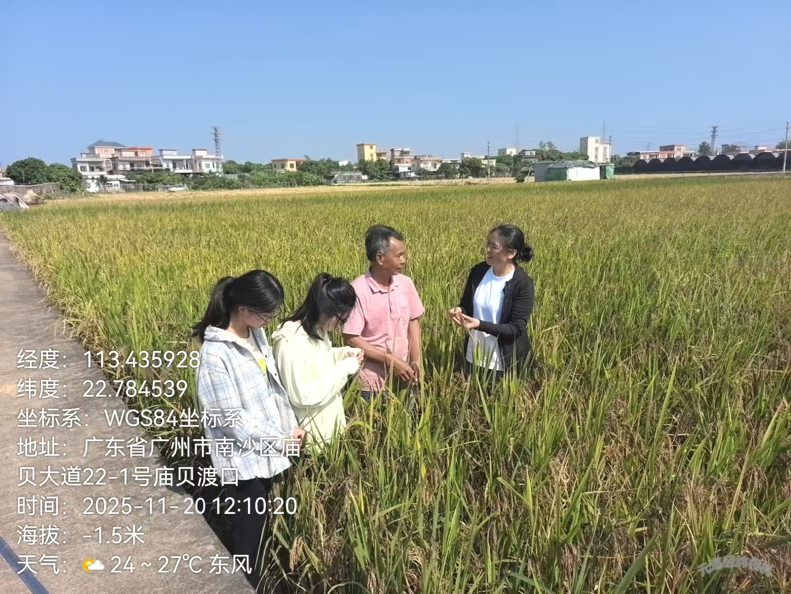 2025年11月20日,华南农业大学国家植物航天育种工程技术研究中心(以下简称“中心”)广州市农村科技特派员团队前往南沙区大岗镇东隆村,开展晚季试种的6个功能型特种稻新品种的田间调查、取样与采收工作。此次试种的功能型水稻新品种属于“中心”承担的广州市农村科技特派员专题项目“功能型优质香丝苗新品种测试与推广”的重要研究内容。项目旨在通过实地种植与系统性的田间性状调查,筛选出更适宜本地种植条件的功能型水稻品种,助力农业提质增效。随着消费需求从“吃得饱”向“吃得好、吃得健康”转变,富含花青素的功能型特种稻受到越来越多的关注。本次试种的6个品种均表现出高花青素含量特点,所有品种在当地全生育期内生长良好、正常结实,其中2个有色稻新品种表现尤为突出,综合农艺性状优良。